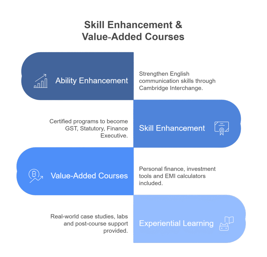 • Skill Enhancement: Certified programs like GST Executive, Statutory Executive, Finance Executive (30–90 hrs)